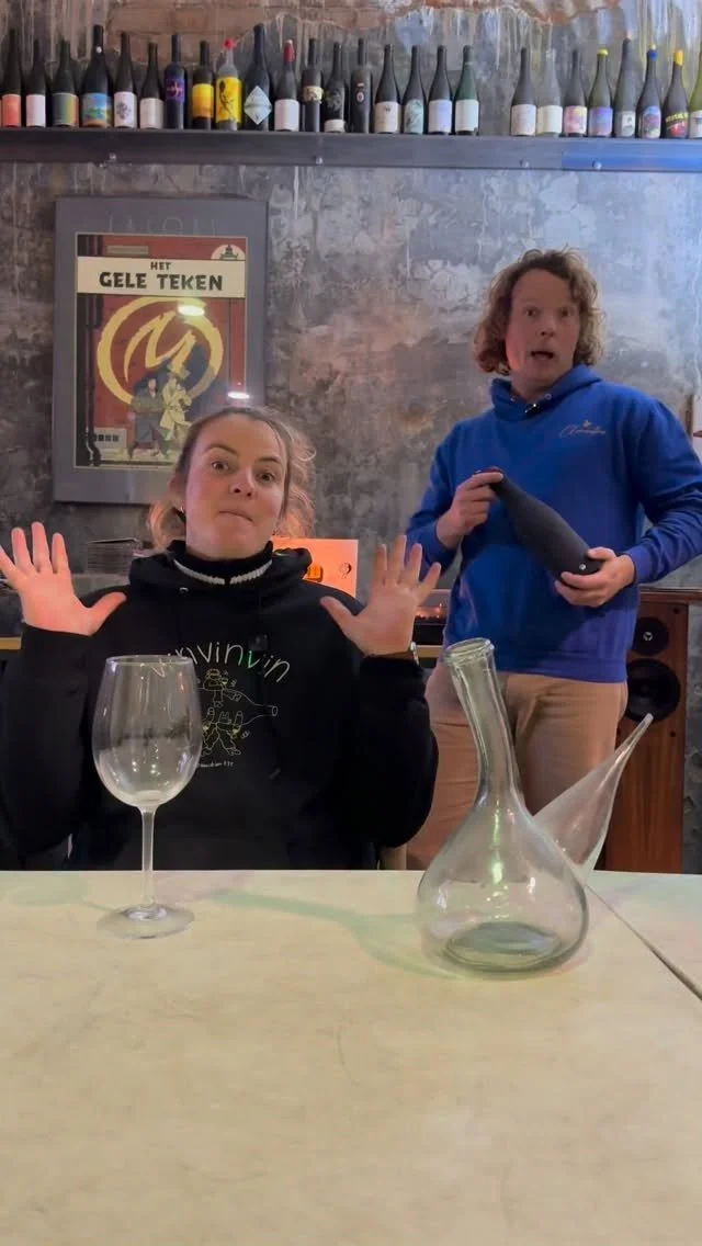 Two people sitting at a wooden table with wine bottles and glasses, one drinking from a glass, in a relaxed setting.